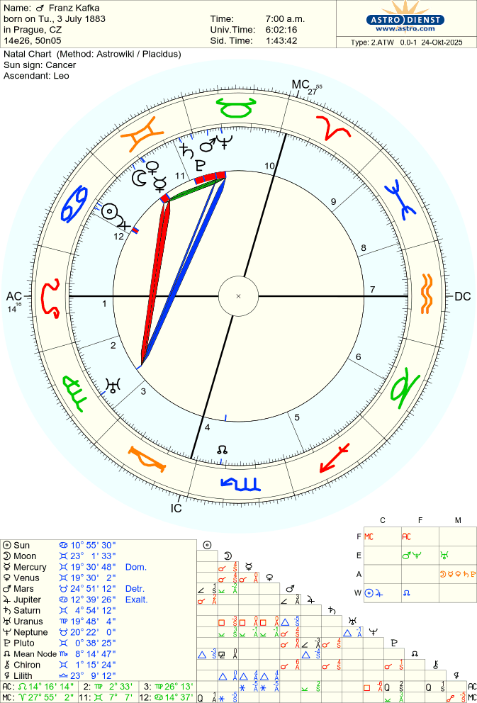 Sus planetas en esas casas lo situaban frente a las estructuras sociales y los sistemas humanos, aunque su alma los observaba desde fuera, analizando su lógica y su vacío. Urano en casa 2, fuera del grupo principal, actuaba como una grieta simbólica por donde su energía buscaba liberarse, canalizando lo reprimido hacia la escritura. Kafka encarnó la esencia de este modelo: la mente que se concentra para entender el orden externo, pero que acaba revelando, en su intento de comprenderlo, la profundidad de su propio mundo interior.